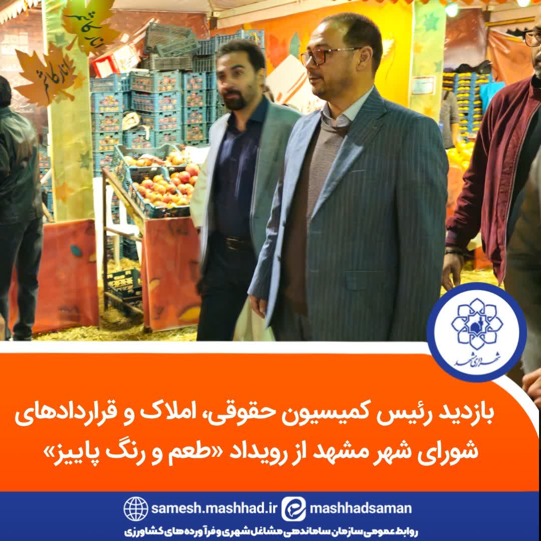 رئیس کمیسیون حقوقی، املاک و قراردادهای شورای شهر مشهد از رویداد «طعم و رنگ پاییز»بازدید کرد.